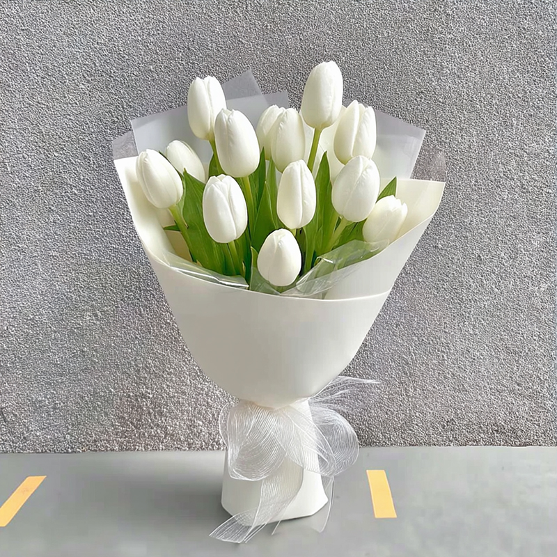 This bouquet of white tulips is like a fragment clipped from moonlight. The pure white buds resemble untouched snow, holding gentle dreams within; the pale green stems are like spring's silken threads, tied with delicate joy. The plain white wrapping is like a cloud’s feathered robe, softly embracing the quiet abundance, while a transparent ribbon forms a graceful knot — as if gathering the glow of the night and the whispers of flowers into this fragrant bundle. When eyes fall upon it, one drifts into a whirlpool of white serenity, even the breeze carrying a faint sweetness, gently telling a tale of peace.
